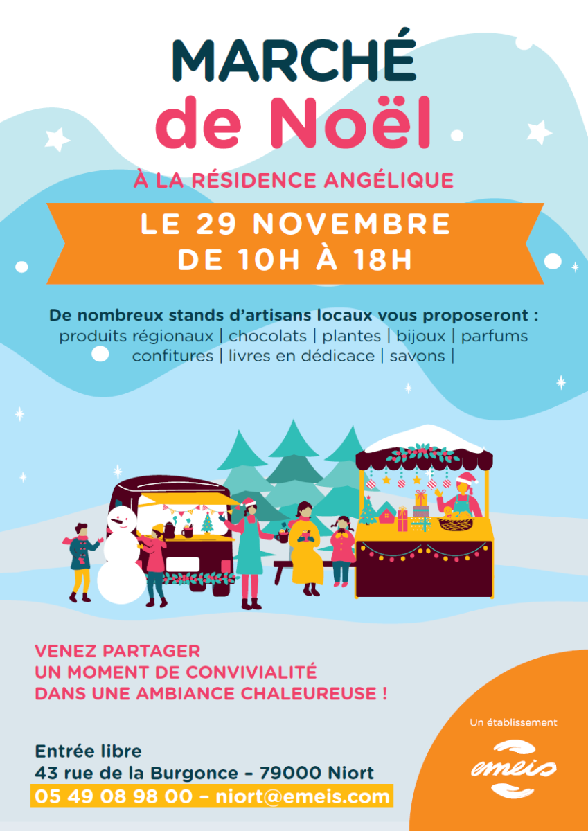 Chers résidents, familles et amis, Nous avons le plaisir de vous inviter à notre Marché de Noël, qui se tiendra : le vendredi 22 novembre de 10h à 11h au sein de la résidence Venez partager un moment chaleureux et festif autour des stands d'...